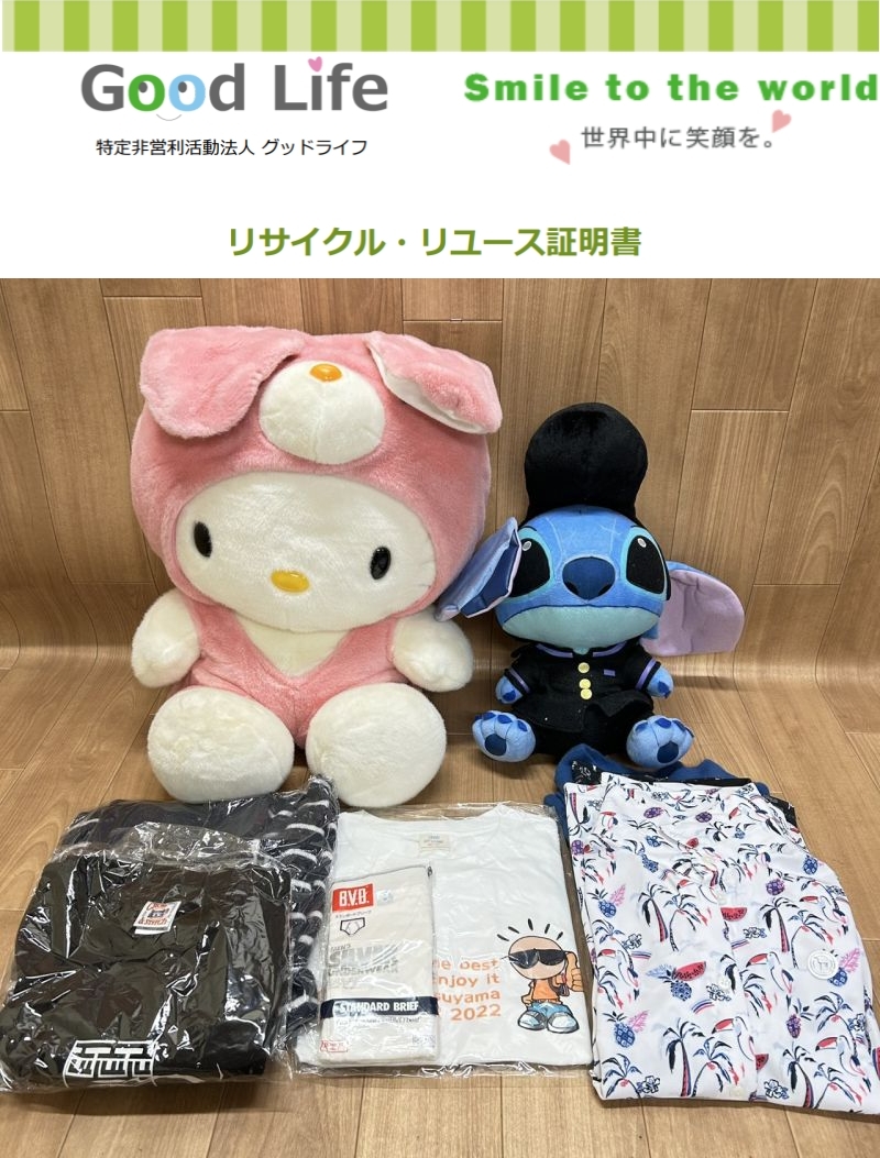 ぬいぐるみを送っていただき、ありがとうございます。 シロクマさんや、ポケットモンスターなどのぬいぐるみがあり、状態も良好ですね。 その他にも、キティちゃんや、ミッキーマウスなどの色々な雑貨類をいただきました。 英字の絵本や、未使用の女性用のストッキングなどもあります。 仕分けをして、それぞれ活用していただくため、リユースさせていただきますね。