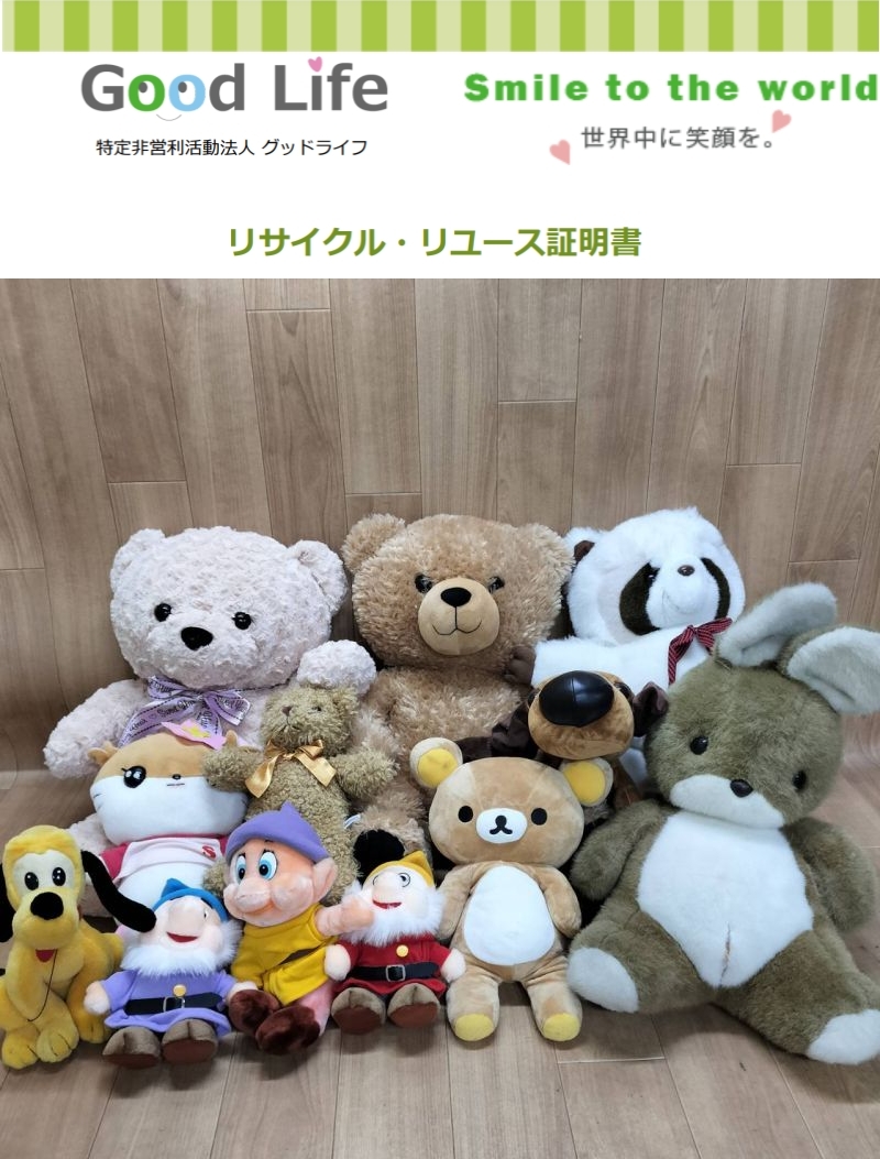 ぬいぐるみを送っていただき、ありがとうございます。 スパイファミリーのアーニャ、バイキンマン、アンパンマン、赤ちゃんマン、花柄のクマさん等があり、状態も良好ですね。 その他には、箱入りで、MOONSTARのショーツブーツや、アシックスのスニーカーもいただきました。それぞれリユースをして、遊んだり、毎日の生活で活用していただきますね。