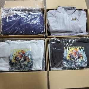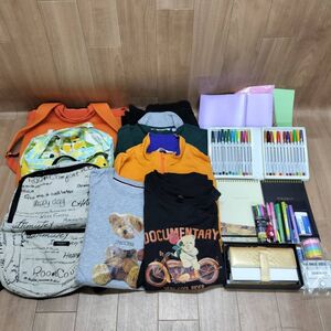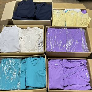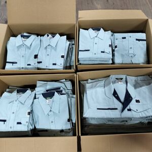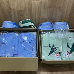 ようふくを送っていただき、ありがとうございます。 タグ付きの未使用品もたくさんあり、状態も良好ですね。 青色の作業服のジャンバーやボトムス、ストライプや無地のワイシャツ、女性用のフリルがたくさんついている可愛いお洋服等、色々な種類のものがありますね。 これから仕分けをして、リユースをして活用していただきますね。