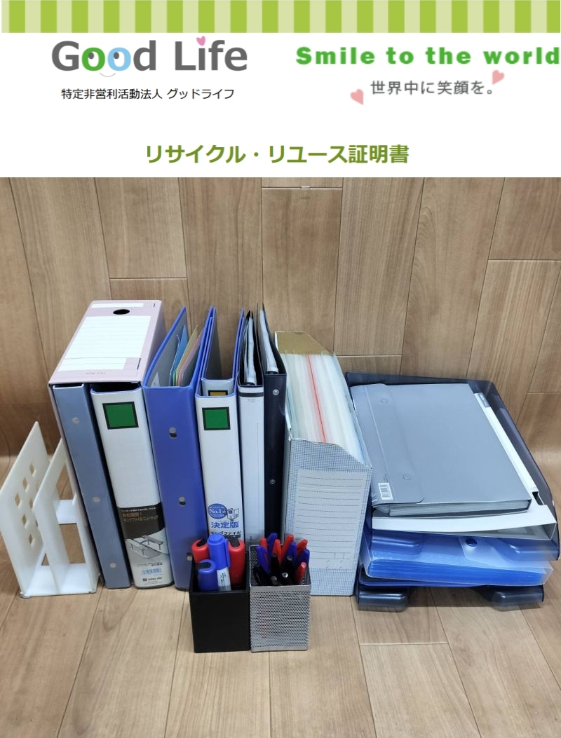 黒色のランドセルを送ていただき、ありがとうございます。 目立ったキズやヨゴレなどもなく、状態も良好ですね。 必要なお子様にお届けして、元気よく学校に通っていただきますね。 その他には、書類ケースや、ダブルクリップなどの事務用品をいただきました。 こちらもリユースをして、しっかりと活用していただきますね。