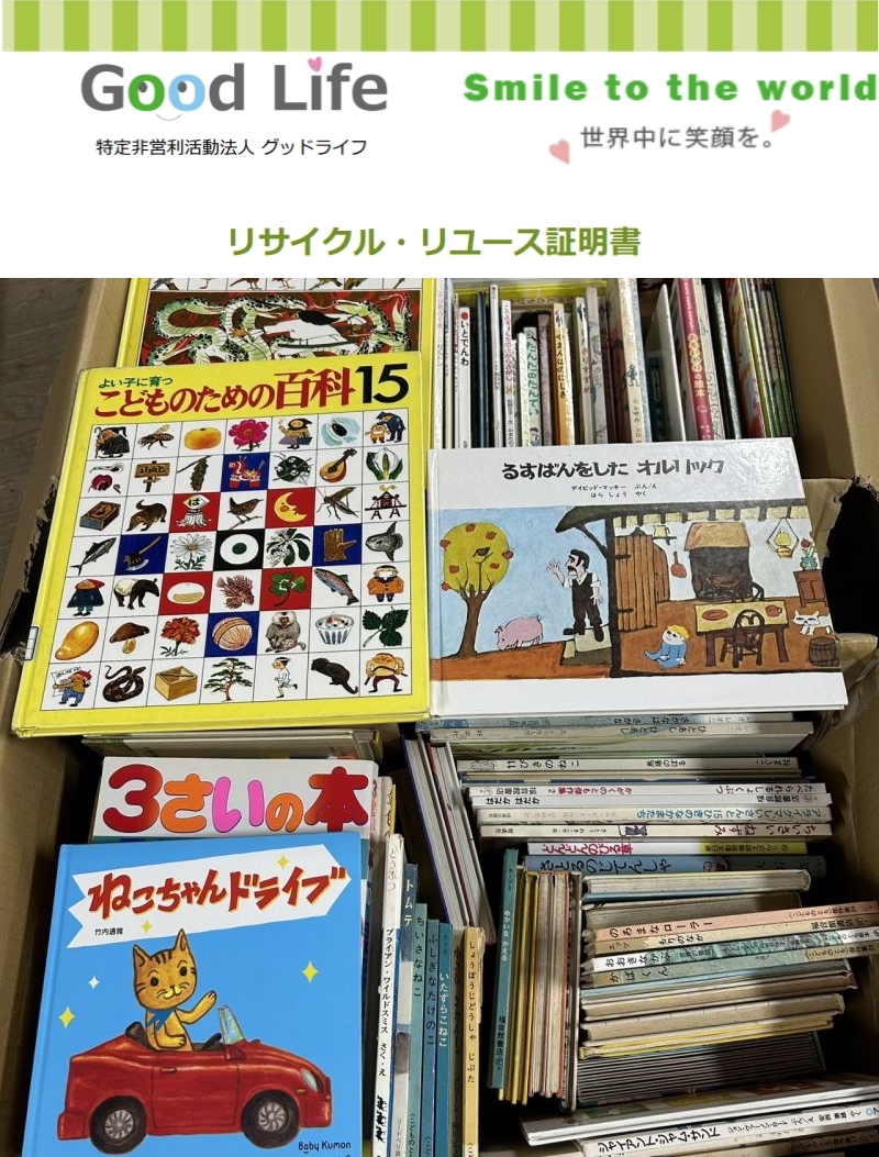 たくさんのお子様向けの本を送っていただき、ありがとうございます。 いろいろなお話の本や、写真がたくさんの本、あいうえお等を楽しく勉強できる本など、種類もたくさんあり、状態も良好ですね。 ブタさんのお話やおむすびころりん等の、紙芝居もいただきました。 懐かしいですね。お子様と一緒に楽しんでいただきたいですね。 すべてリユースさせていただきます。