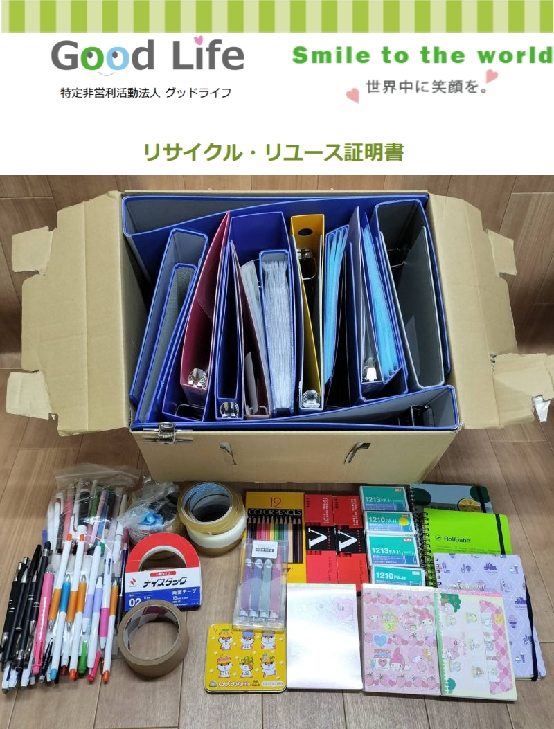 事務用品類を送っていただき、ありがとうございます。 色々な厚さのファイル類や、ブックスタンド、書類ケース、クリアファイル、マジックやマーカーなどの筆記用具などがあり、状態も良好ですね。 それぞれリユースをして、日常生活やお仕事などで役立てていただきますね。