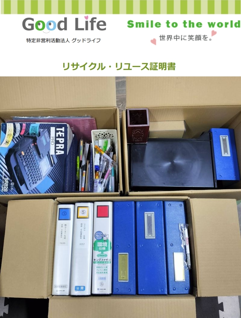 文房具や事務用品をたくさん送っていただき、ありがとうございます。 色々な厚さや種類のファイルや、日付の回転ゴム印、水性顔料マーカー、ダブルクリップ、ハサミ等があります。 状態も良好ですね。 お仕事や日常生活で必要な方にお届けして、しっかりと活用していただきますね。
