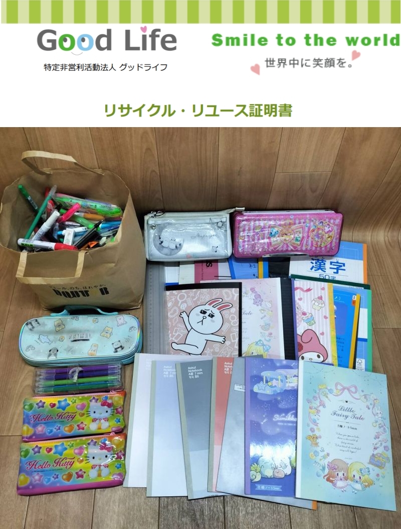 門真市立第七中学校様より、文房具 1箱を、セカンドライフに寄付して頂きました。