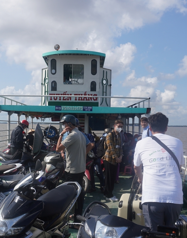 雄大なメコン川を、ローカルな渡し船で渡ります。