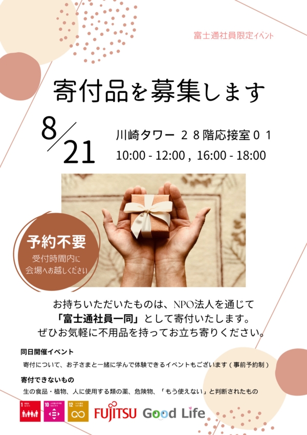 寄付会の当日は、お子様と一緒に寄付について学べるイベントがあり、セカンドライフより代表の村田が出席予定です。