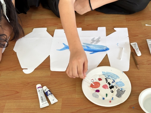 クラフトボックスに、綿棒と水彩絵の具でお絵描きをした後、組み立ててギフトボックスにします。