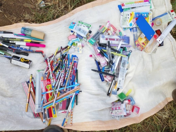 文房具が無くて、本当に困っていたようで、寄付品の文房具を見せたところ、大きな歓声が上がりました。