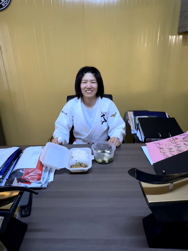 この日のランチは、親子丼とみそ汁で、選手もコーチも美味しそうに食べていました。