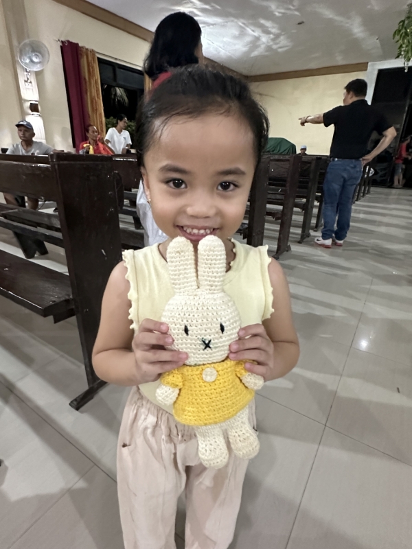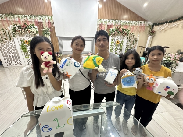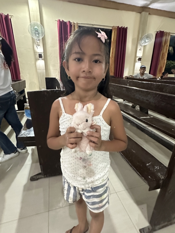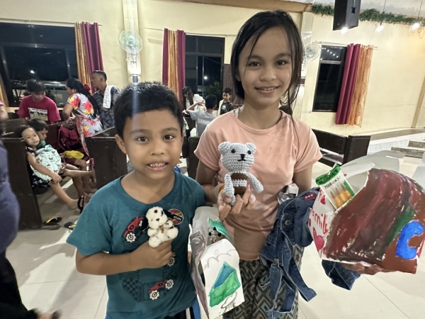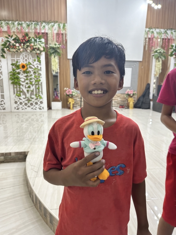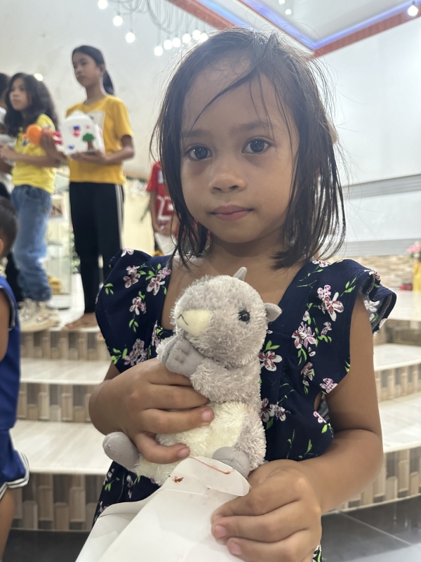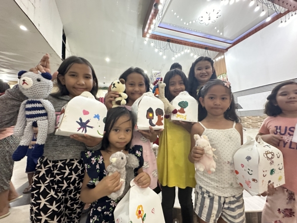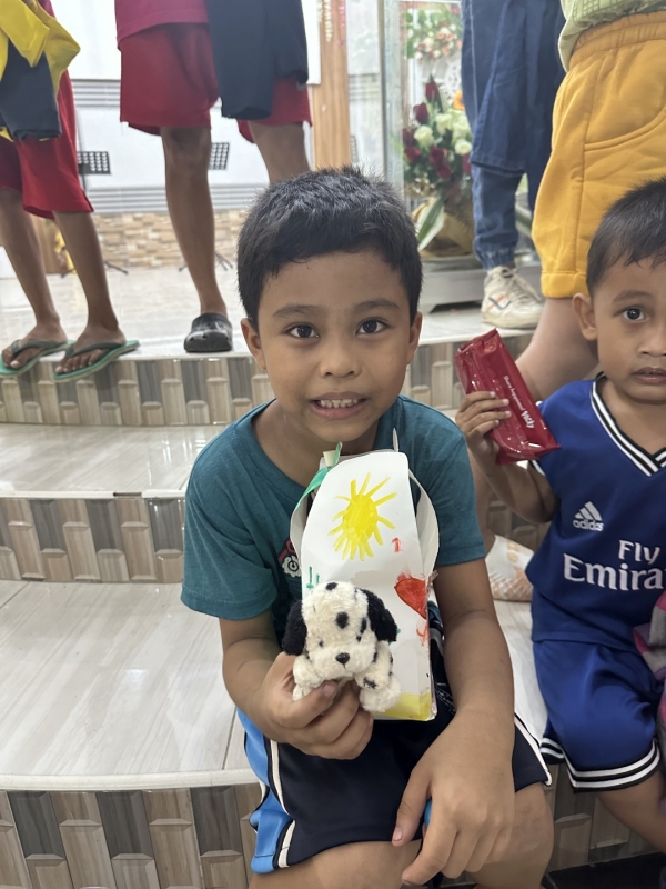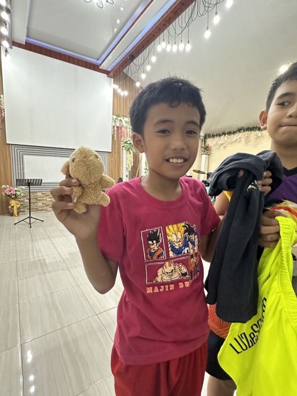 教会でお絵描きを行った後、ぬいぐるみや文房具の寄付を行いました。