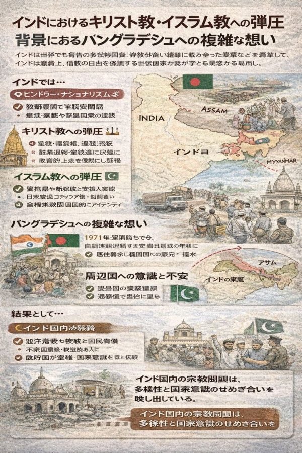 インドにおけるキリスト教やイスラム教への弾圧や圧力は、単なる宗教対立ではなく、「歴史認識」「国家意識」「周辺国との関係」「国内政治」が複雑に絡み合って生じている現象です。その背景を理解するには、インド人の視点だけでなく、バングラデシュ側から見たインド像を併せて捉えることが重要です。