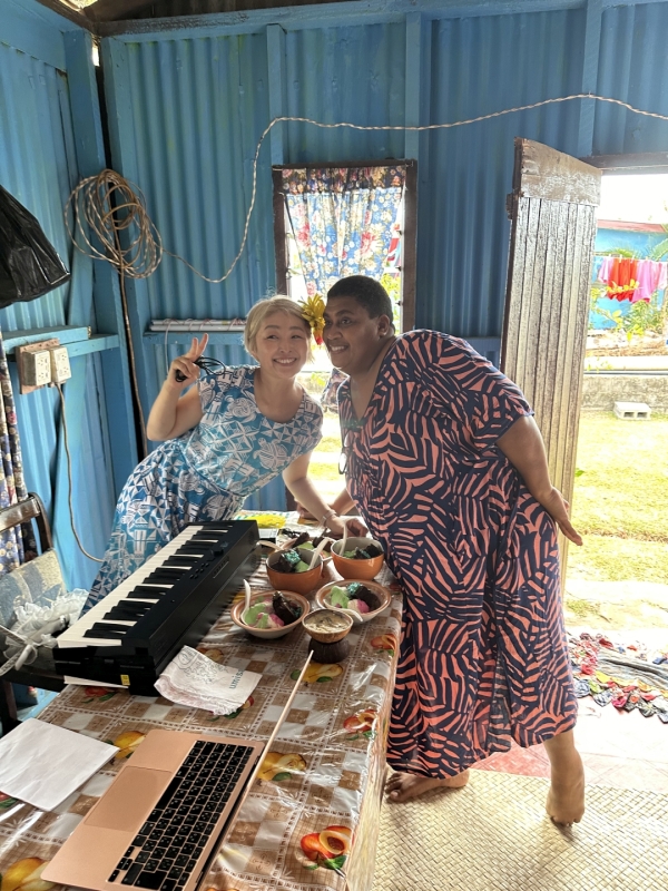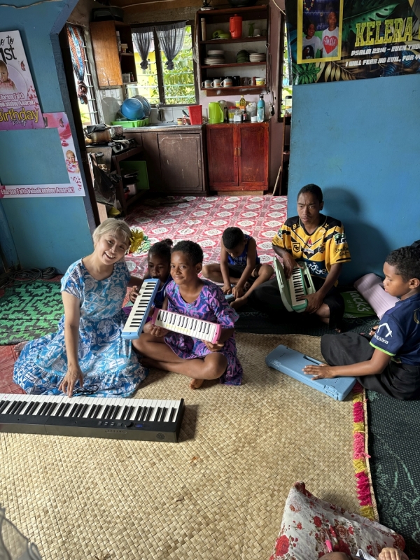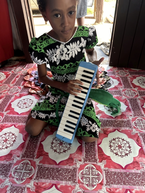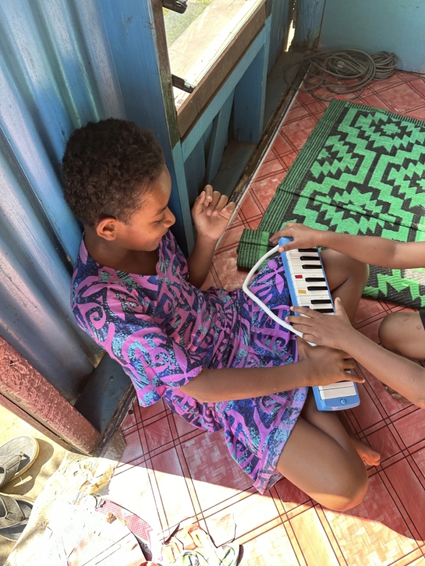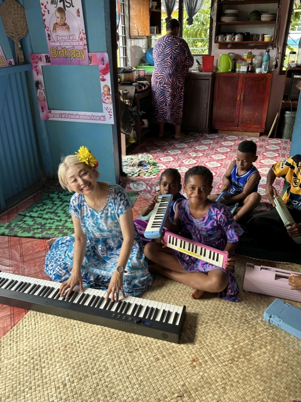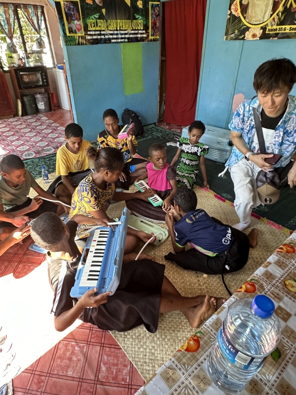 村の視察が終わると、近所の子供たちを集めて、鍵盤ハーモニカの初心者レッスンを行いました。