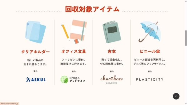 クリアフォルダ、本、傘、文房具の4品目のうち、NPO法人グッドライフは、文房具の寄付でご協力させて頂く事になりました。