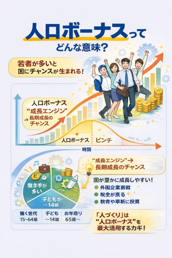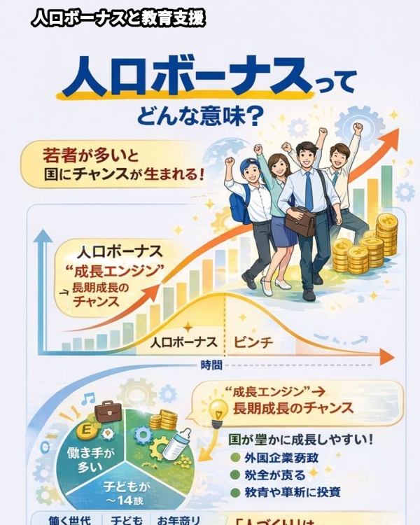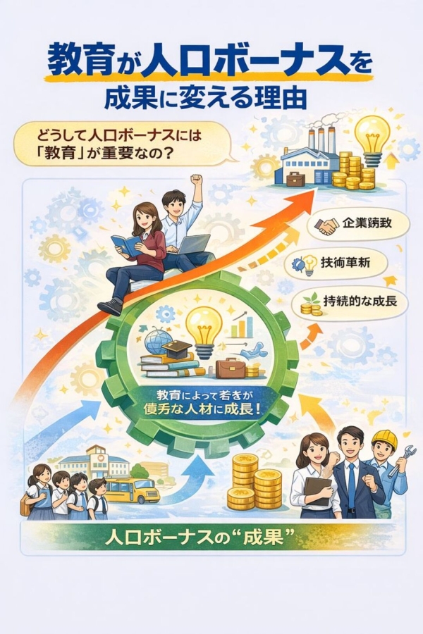 人口ボーナスとは、若く働ける世代が多いことで国が成長しやすい状態を指します。しかし、若者が多いだけでは経済成長は起こりません。教育こそが、人口ボーナスを「成果」に変える最大のカギです。